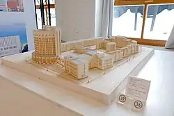 11-этажное здание подковообразной формы на углу проспекта Ленина и улицы Луначарского первоначально задумывалось как общежитие для одиноких сотрудников НКВД и командированных. Первоначальное проектное название — «Дом образцового быта для малосемейных и одиноких». Уже с 1934 года из-за резкого роста числа молодых семей сотрудников, прослывших в обществе выгодными женихами, руководство ведомства вынуждено было отдать часть комнат под их расселение. В дальнейшем число молодых семей, проживавших в общежитии, постоянно росло. Угловое здание необычной формы, выходящее фасадом на площадь Парижской коммуны, стало композиционным акцентом всего комплекса и его высотной доминантой[4][2][5][6][3].