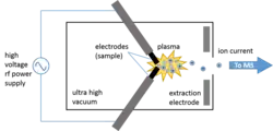 В наиболее распространенная конфигурация: искровой разряд в вакууме генерируется между двумя электродами при помощи подачи переменного напряжения радиочастотного диапазона и амплитудой в несколько десятков киловольт. Концами электродов являются анализируемые образцы. Процессы в плазменном разряде вызывают испарение, атомизацию и ионизацию материала пробы. Генерируются в основном однозарядные атомарные ионы.