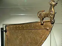 Деревянный жезл с вырезанной звериной головой найден в Осебергской ладье- Фрагмент Осебергской ладьи (ок. 834 год)