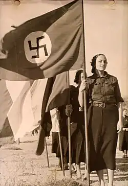 Женская организация. Sección Femenina была женской ветвью испанской фаланговой партии JONS, а затем FET и JONS. Во время гражданской войны посвящали себя оказанию поддержки семьям погибших на стороне повстанцев в боях. Также стихийно организовывали базовую помощь населению (продовольственные ранчо для детей, одежду, здоровье, раздачу продовольственных карточек и т. д.)[20].