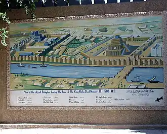 Беспрецедентного размаха достигло дворцовое строительство. Вместо временной резиденции Набопаласара, разрушенной одним из паводков, Навуходоносор II возвёл новый роскошный дворец в северо-западном углу Восточного города. Окружённый мощными фортификационными сооружениями, этот, так называемый Южный дворец состоял из пяти комплексов построек, каждый из которых представлял собой отдельную крепость внутри общей дворцовой крепости. Для защиты этого комплекса от вод Евфрата, прямо в середине русла реки был выстроен мощный бастион. Согласно традиции, для одной из своих жён — мидийской царевны Амиитис — царь приказал возвести знаменитые Висячие сады — второе из Семи чудес света. В ближайшем к Евфрату замке, что располагался у Ворот Иштар, Навуходонсор II за пятнадцать дней выстроил ещё один, так называемый Центральный дворец. Последний играл роль своего рода музея, где хранились древние надписи, рельефы, статуи, библиотека, трофеи, добытые вавилонскими царями во время походов, в том числе и в Ассирию. Наконец, третий, Северный или Летний дворец был выстроен в районе предместий. По форме он представлял мощную крепость, охранявшую северный вход в предместья на линии внешней стены. Довольно быстро область в округе Северного дворца превратилась в элитный район Бит-шар-Ба́били (аккад. Bīt-šar-Bābili «Дом царя Вавилона»), застроенный виллами вельмож и богачей[32].