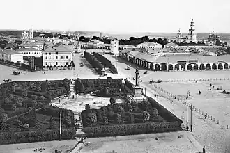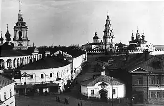 В то время город разделялся на кремль (старый город), новый город и посад. Из уникальной росписи кремля 1678 года[26] следует, что он был окопан глубокими рвами и обнесён земляными валами и деревянной стеной с многочисленными башнями. Помимо каменного Успенского собора, который был в XVII веке расширен, с прибавлением обширного Феодоровского придела, ближе к Волге стоял Здвиженский монастырь с шатровым храмом. В старинных описях также упоминается о существовании в кремле церквей Троицкой и Похвалы Богородицы.