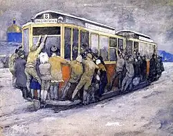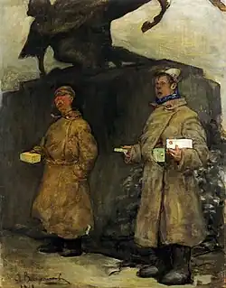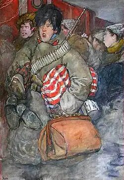 После Октябрьской революции в Петрограде начали развиваться новые формы искусства, частично вдохновлявшиеся эстетикой Великой французской революции, город обвешивали лозунгами, плакатами, знаками, знамёнами и т. д. В их создании участвовали многие известные художники, например Самохвалов[143]. Важной формой революционного искусства были также открытки, жетоны, медали[144]. Советское искусство развивалось в условиях романтической полурелигиозной веры в торжество социальной справедливости. Искусство стало площадкой для экспериментов у многочисленных молодых художников, деятельности которых большевистская власть, несмотря на явную раздражённость, предпочитала не мешать. Часто такие произведения были выполнены в кубофутуристическом стиле. Проблема подобного стиля заключалась в том, что он не воспринимался большей частью населения. Старая интеллигенция смотрела на него с иронией, а рабочим классам он не был интересен[144]. В годы гражданской войны деятели искусств поселились в доме № 15 на Невском проспекте[145], где устраивали литературные и музыкальные вечера, выставки, бесплатные экскурсии[146].