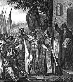 В 988 году князь Владимир после похода на византийский Херсонес и женитьбы на сестре византийских императоров Анне утвердил восточное христианство на Руси в качестве государственной религии[125][126]. Принятие христианства укрепляло княжескую власть и территориальное единство Древнерусского государства. Оно имело большое международное значение: Русь, отвергнув язычество, стала теперь равной другим цивилизованным народам. Принятие христианства содействовало развитию зодчества и живописи в средневековых её формах, проникновению византийской культуры как наследницы античной традиции. Особенно важным было распространение кириллической письменности и книжной традиции: именно после крещения Руси возникли первые памятники древнерусской письменной культуры[127].