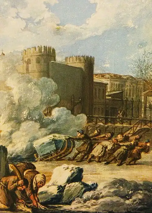Улицы, изначально выступавшие почти только пешеходными, заполонили транспортные средства. Тогда не было деления дороги на транспортную и тротуарную и отсутствовали правила дорожного движения, в итоге горожане часто попадали под колёса или копыта лошадей[9]. Тогда была мода на езду с шестью лошадьми, запряжёнными форейторами, и возникла традиция непременно вывозить своих господ с балов первыми, из-за чего устраивались гонки, а вместе с тем — массовые аварии и смерти случайных прохожих или участников. Эта традиция была запрещена при Павле I[112], вскоре Павел приказал выгнать из города всех извозчиков, но снова позволил им вернуться[113].