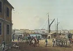 Реки и каналы в Петербурге являлись важными транспортными артериями, в особенности для грузовых перевозок[90]. При этом с ростом населения и торговли росло и количество судов, которым в итоге стало не хватать места в реках и каналах[91], что приводило к скучиванию судов[91] и борьбе между судовладельцами за лучшие места у пристаней. Каналы также помогали осушать изначально болотистую местность и снижали ущерб от наводнений, выступая резервуарами[41]. Основным местом для стоянки судов была построенная ещё при Петре I Галерная гавань, тогда ещё за чертой города и рядом с которой располагался рабочий городок[92].