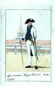К концу XVIII века мода на массивные женские наряды под влиянием французской моды сменилась на более свободные и скромные платья с высоко поднятой талией, якобы повторявшие фасон древнегреческих платьев. Волосы завивались в локоны. Изменились и представления о женской красоте. Среди знатных женщин отныне ценилась бледная кожа, хрупкое, изящное телосложение[165]. Мужчины вместо кюлотов и роскошных камзолов начали носить сюртуки и длинные панталоны[165]. Дворяне в остальной России подражали моде петербургских дворян[164]. Молодежь начинала носить фраки и круглые шляпы, отращивать бакенбарды вошедшие в моду во Франции после французской революции. Вошедший на престол Павел I начал борьбу с новомодными течениями, запретив вышеописанные элементы гардероба[166].