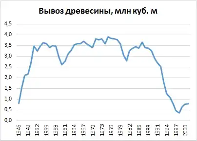 Лесная и целлюлозно-бумажная отрасли промышленности достигли пика своего развития. В 1975 году вывозка древесины составила 3,9 млн кубических метров, после чего в отрасли начался спад. Это было связано с истощением запасов древесины (ель и пихта) вследствие 70-летней беспрерывной вырубки лесов, а также лесных пожаров. Местные ЦБЗ за весь период так и не смогли выйти на показатели, определенные советским руководством в 1964 году, по производству целлюлозы (500—600 тысяч тонн) и бумаги (250—300 тысяч тонн)[31].