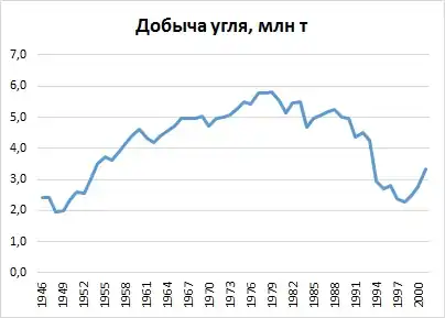 Угледобыча в начале рассматриваемого периода развивалась устойчиво: внедрялись средства автоматизации, увеличивалось количество горных машин и комбайнов. Шахтёры обеспечивали углем всех потребителей области, в отдельные годы даже наблюдались сложности со сбытом топлива. В 1979 году добыча угля достигла максимального за весь советский период значения в 5,8 млн тонн. В 1980-е годы начался спад отрасли из-за выбытия мощностей, к тому моменту действовали 13 шахт, Лермонтовский и Новиковский угольные разрезы. Так, в 1984 году добыча составила 4,7 млн тонн, что было меньше уровня 1965 года. При этом потребности региона в угле составляли 5,5 млн тонн, в результате область нуждалась в привозном угле[32]. Если в общем топливном балансе страны уголь в конце 1970-х годов составлял около половины, то в Сахалинской области — почти три четверти[33].