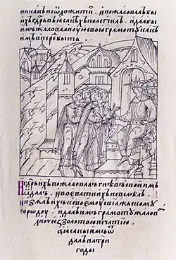 Заключение князем Владимиром мира с волжскими булгарами в 985 или 986 году. Миниатюра конца XV века из Радзивилловской летописи