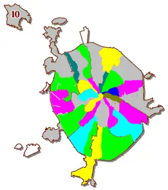 Части Москвы в 1895 году (занумерованы римскими цифрами, границы нанесены тонкими чёрными линиями)