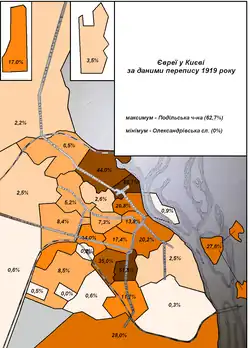 Во время Русской и украинской революций власть менялась несколько раз, смена власти сопровождалась новыми погромами евреев. После провозглашения Украинской Советской Социалистической Республики (УССР) еврейское население Киева выросло в несколько раз и достигло 224 000 человек (по данным переписи 1939 года)[1].