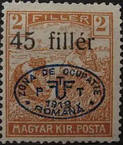 В декабре 1919 года была выпущена серия доплатных марок, а в январе 1920 года — почтовых марок оригинальных рисунков с надписью «Magyar posta» и с надпечаткой в круглой рамке «Romania. Zona de ocupatie» («Румыния. Зона оккупации»). Существуют перевёрнутые надпечатки. В обращении они практически не были.