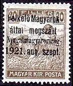 В марте 1920 года Венгрия была объявлена королевством. В 1921 году на марках Венгрии снова появилась надпись «Magyar Kir. Posta» («Венгерская королевская почта»). Она употреблялась с перерывами (в 1923—1937 годах на марках помещалась надпись «Magyarorszag» («Венгрия»)) до 1945 года. Темами выпусков тех лет были — религиозные символы, корона Святого Стефана, административные здания, церкви, эпизоды борьбы против турецкого ига и т. п.[1][7]