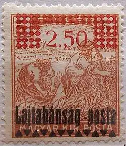 В январе 1946 года на марках были сделаны надпечатки, указывающие вид почтового отправления, для которого предназначалась данная марка. Продавались они по цене, существовавшей в момент продажи. Эти надпечатки имели сокращения: «Any.» — бандероль, «Hl.» — местное письмо, «Hlp.» — местная почтовая карточка, «Tl.» — внутреннее письмо, «Tlp.» — внутренняя почтовая карточка, «Cs10-I» — для посылок до 10 кг и т. д. В мае 1946 на марках было надпечатано полное название вида почтового отправления: «Tavolsagi level» — письмо, «Ajalas» — заказное, «Csomag 5 kg» — посылка 5 кг и другие[1].