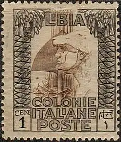 С 1912 года для колониальной Ливии выпускались итальянские почтовые марки с надпечатками «Libia» («Ливия»)[9]. Позднее, начиная с 1921 года, специально для Ливии были эмитированы итальянские колониальные выпуски оригинальных рисунков[11][14]. Все почтовые марки колониальной Ливии печатались в итальянской государственной типографии[14]. В период итальянского господства (1912—1943) на оригинальных ливийских марках имелись надписи на итальянском языке: «Colonia Italiane Libia» («Итальянская колония Ливия»), «Poste» («Почта») и «Poste Italiane» («Итальянская почта»), а также на арабском языке[9].