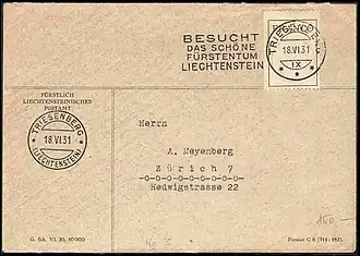 10 июня 1931 года были изданы две миниатюры специально для корреспонденции, перевозившейся в тот день дирижаблем «Граф Цеппелин» из Вадуца в Лозанну. Марки гасились специальным штемпелем «Vaduz luni 1931 Zeppelinpost nach Lausanne» («Вадуц, июнь 1931. Цеппелинная почта в Лозанну») красной краской[3].
