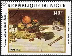 | «Фрукты на столе» Эдуарда Мане (1864 г.) на почтовой марке Нигера 1982 г. (Sc #?) | |