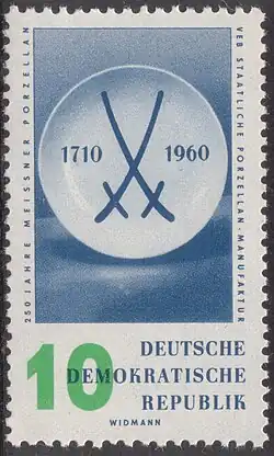 Сюжеты о самой Саксонии и связанные с ней много раз появлялись на почтовых марках немецких государств. Например, в 1960 году вышла серия из пяти марок ГДР в ознаменование 250-летия государственной фарфоровой мануфактуры в саксонском городе Мейсен. На одной из миниатюр была изображена тарелка со знаком в виде двух скрещённых мечей. Эти мечи являются одним из элементов герба Курфюршества Саксония, а также эмблемой самого предприятия, которой традиционно маркируются изделия из мейсенского фарфора. Мейсен обязан основанием фарфорового производства Августу II Сильному, тогдашнему саксонскому курфюрсту[44].