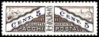 С ноября 1928 по август 1972 года выпускались посылочные марки такого же типа, как и в Италии, состоящие из двух частей. Левая часть наклеивалась на формуляр, прилагаемый к посылке, а правая — на корешок, остающийся у отправителя. Рисунок у всех выпусков посылочных марок был одинаков — виды Сан-Марино. Надпись на марках — «Pacchi postale»(«Почтовые посылки»). Посылочные марки были изъяты из обращения в 1992 году[10][16].