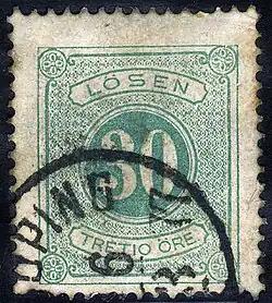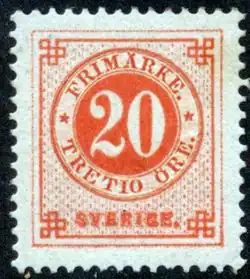 В 1872 году в серии марок «Цифры в круге» была впервые в Швеции применена двухцветная печать. Миниатюра с самым высоким номиналом в 1 риксдалер была напечатана в коричневом и голубом цветах (в 1886 году эта марка была напечатана с номиналом, выраженным в новой шведской валюте — 1 крона)[1]. Среди марок 1872 года есть интересная разновидность: почтовая миниатюра номиналом в 20 эре известна с надписью «TRETIO» («тридцать») вместо «TJUGO» («двадцать»). Эта ошибка возникла в 1879 году при допечатке тиража. Известно всего 970 экземпляров таких марок[6]. Серия «Цифры в круге» была повторена в 1886 году с напечатанным на задней стороне марки почтовым рожком голубого цвета (позже рожок стали печатать под слоем клея)[1][10].