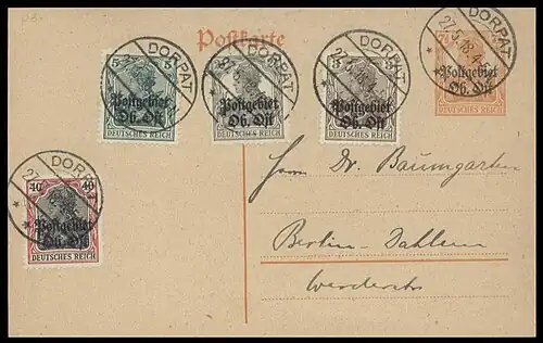 В марте 1918 года в Дорпате (Тарту) германской оккупационной администрацией был осуществлён местный выпуск. На марках Российской империи 17-го выпуска была сделана чёрная типографская надпечатка нового номинала (20 и 40 пфеннигов). Марка в 20 пфеннигов известна с перевёрнутой надпечаткой. Марки гасились однострочным штампом «DORPAT» серой краской. Были в обращении до 20 декабря 1918 года. Надпечатка была также сделана на почтовой карточке Временного правительства[7][9].