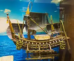Старейшие изображения индийских кораблей можно увидеть на монетах, которые во II веке чеканили Сатаваханы. Одно время они контролировали Бхаруч на западе и значительный участок побережья Бенгальского залива. Судно со сатаваханских монет имеет высокий нос и корму, две двуногие мачты и два боковых руля. Китайский посол Кан Дай, посещавший в III веке Юго-Восточную Азию, писал, что из дельты Инда ходят большие торговые суда с семью парусами, которые с муссонами за месяц достигают Римской империи (вероятно, имелась в виду южная Аравия, которую в те времена считали началом римского мира)[45].