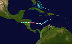 Волна-предвестник Йоты вызвала внезапные наводнения на большинстве островов Карибского бассейна. Первые предупреждения и наблюдения за тропическим циклоном были выпущены 14 ноября в Колумбии, Никарагуа и Гондурасе, причем две последние страны все ещё восстанавливаются после урагана Эта. Сильные дожди, связанные с тропической волной и Йотой, вызвали ливни в некоторых частях Колумбии, что привело к внезапным наводнениям и оползням. Чрезвычайно сильный дождь выпал на большую часть территории Никарагуа. Сели вызвали обширный ущерб и несколько смертей. По меньшей мере 61 человек был убит из-за Йоты, в том числе не менее 28 в Никарагуа и 16 в Гондурасе, среди других стран.[1][2][3] Общий ущерб от урагана все ещё подсчитывается, но предварительная оценка ущерба в Никарагуа составляет 564 миллиона долларов США в этой стране.[4]