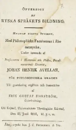 - ↑ Avellan, Johannes Henricus. Öfversigt af ryska språkets bildning 1 (фин.). www.doria.fi (1815). Дата обращения: 2 февраля 2025. Архивировано 10 сентября 2024 года.