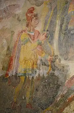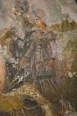 Митра убивает быка. Слева Кавт, справа Кавтопат. Фреска из митреума в Марино (Лациум), ок. 200 г. н.э.