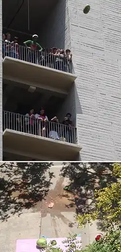 Два других популярных события кампуса сброс тыкв и сброс арбузов, проходящие во время Хэллоуина и в конце весны соответственно[37]. Сброс арбузов — одна из старейших традиций, происходящая с 1965 года от вопроса к экзамену по физике об ускорении свободного падения. Группа студентов решила проверить это на практике, сбросом арбузов с различных этажей и сравнением размеров следов, оставшихся после падения. Сброс тыкв — аналогичная традиция, на которой скидывают тыквы заполненные конфетами с 11-этажного здания Тайога Холл — самого высокого жилого здания колледжа Мьюир.