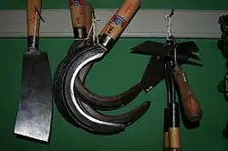 Серпы и косы, отличающиеся друг от друга длиной рукояти, размерами и степенью кривизны лезвия, способами его прикрепления к древку издавна использовали японские воины. Наиболее широкое распространение они получили на флоте, где их применяли в качестве багров для подтягивания вражеских лодок при абордаже и для обрубания морских водорослей, затруднявших ход судов на мелководье[2].
