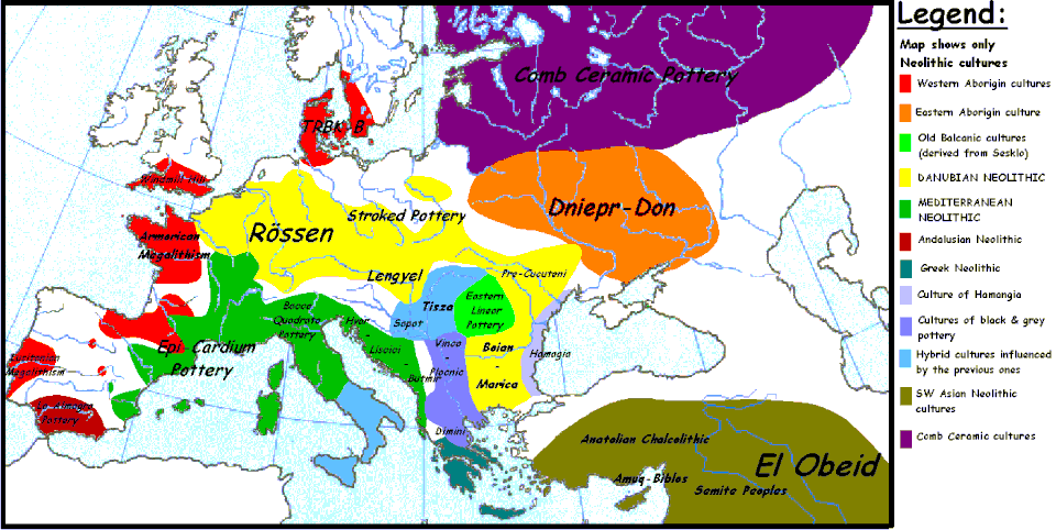 Неолитический период в истории Европы продолжался примерно с 7-го тыс. до н. э. до 18 в. до н. э. При этом культурные новации продвигались в глубь Европы с юго-востока на северо-запад со скоростью примерно 1 км в год. Так, греческому неолиту с развитым сельским хозяйством по времени соответствует мезолит на севере Европы, а раннему бронзовому веку в Греции — неолит на севере. На юго-востоке Европы неолит продолжался примерно до 30 в. до н. э., а на северо-западе первые предметы из бронзы появились на 12 столетий позже.