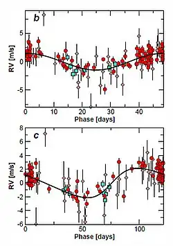 Для поиска экзопланет в системе этой звезды, астрономы использовали спектрометр HARPS (High Accuracy Radial velocity Planet Searcher), принадлежащий Европейской южной обсерватории[6], а так же HIRES (High Resolution Echelle Spectrometer) в обсерватории Кека на Гавайях и PFS (Planet Finder Spectrograph) на телескопе Магеллан II в Чили[7]. Всего было произведено 104 замера лучевой скорости звезды. Из них 66 на HARPS, 30 на HIRES и 8 на PFS. На графике слева красными окружностями показаны замеры лучевой скорости звезды, полученные на HARPS, серыми ромбами - замеры на HIRES, голубыми квадратами - на PFS. Достаточно высокие погрешности единичных замеров, полученные на HIRES, объясняются тем, что на Гавайях, где расположена обсерватория имени Кека и спектрограф HIRES, звезда Каптейна никогда не поднимается над горизонтом выше 26°.