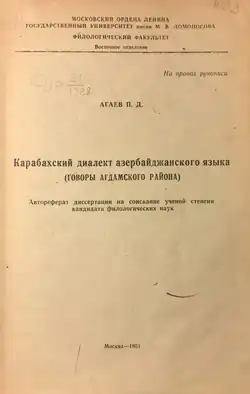 Авторефераты диссертаций о говорах Агдамского (П. Д. Агаев, 1951), Физулинского (И. М. Мамедов, 1958) и Агджабединского районов (И. К. Кулиев, 1977) | ||||||||||