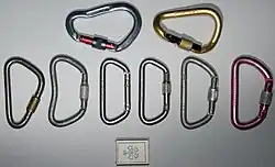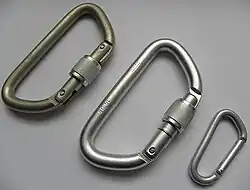 внизу слева направо — D-карабин с винтовой муфтой, HMS-карабин с автоматической муфтой