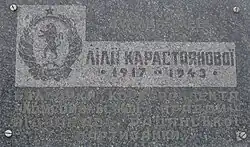 Справа от барельефа высечены слова болгарского поэта Христо Ботева: «Кто пал в борьбе за свободу, тот не умирает». Ниже надпись: «Здесь, в знаменитом партизанском Лесограде, с декабря 1942 г. по февраль 1943 г., сражаясь с врагом, находилась замечательная дочь болгарского народа, корреспондент «Комсомольской правды» Лилия Карастоянова. Погибла в феврале 1943 г.».