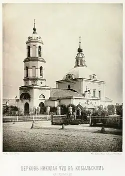 - ↑ Построена вместо прежней, ветхой, в 1736 году купцом Григорием Мушниковым. По преданию, земля, на которой стояла церковь (на Садовой, близ Курского вокзала), по указу царя Алексея Михайловича была взята под пастбища для царских кобылий, и потому будто церковь, выстроенная на этом пастбище, наименована Кобыльской. Некоторые полагают, что церковь так названа от фамилии владельца сей местности Кобыльского; например, в числе полковников Петра (в 1690 г.) находился Иван Кобыльский. Предок Кобыльского имел в этом приходе дом, и от него церковь могла называться «в Кобыльском». Уничтожена в 1930 г.