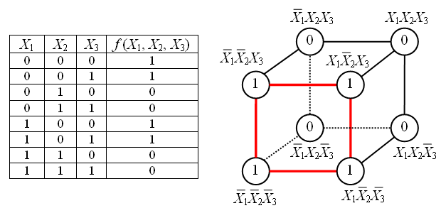 Булевы функции N переменных, представленные в виде СДНФ или СКНФ, могут иметь в своём составе не более чем различных термов. Все эти элементарные термы можно представить в виде некоторой структуры, топологически эквивалентной -мерному кубу, причём любые два терма, соединённые ребром, пригодны для склейки и поглощения.