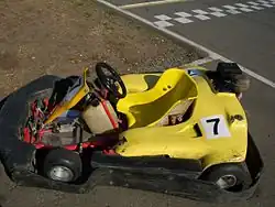 - на большинстве спортивных картов: коробка передач со сцеплением. Вращение на заднюю ось также передаётся через цепную передачу. В зависимости от класса, разрешается от двух до шести передач. Сцепление управляется рычагом, расположенным слева под рулём; рычаг переключения передач расположен справа от сиденья.