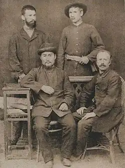 Участники экспедиции в Туркестан: стоят И. Ф. Толшин и В. Т. Васильев, сидят Н. Ф. Катанов и писарь А. П. Бехтерев. Урумчи, 1892 год