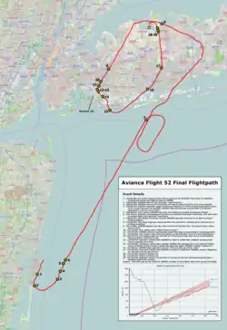 В 21:30:55 КВС дал указание установить закрылки на 14°. Одновременно с ним диспетчер дал указание: Авианка пятьдесят два, следуйте курсом три шесть ноль, пожалуйста. Второй пилот сообщил командиру, что закрылки выпущены на 14°, а когда тот спросил, каким курсом следовать, то ответил, что 360°. В 21:31:01 диспетчер NY TRACON сообщил: О’кей, вы номер два в заходе на посадку. Просто я должен дать вам достаточно пространства, так как вы будете выполнять её без возможности повторного захода[15]. В 21:31:22 КВС спросил: Три шестьдесят, нет?, на что второй пилот ответил: Три шестьдесят. В 21:32:07 рейсу AVA052 было дано указание повернуть на курс 330°[16].