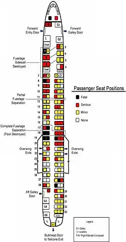 В катастрофе погибли 10 человек — 1 член экипажа (КВС) и 9 пассажиров[3]; 14-летняя пассажирка Рейчел Фуллер (англ. Rachel Fuller) умерла в больнице через 2 недели после катастрофы (14 июня) от полученных ожогов, перенеся ампутацию ноги[4]; ранения получили ещё 110 человек — 4 члена экипажа (второй пилот и 3 стюардессы) и 106 пассажиров.