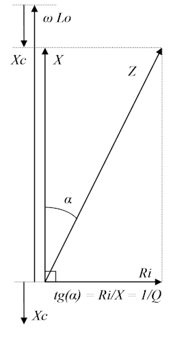 Векторная диаграмма потерь и добротности реальной катушки индуктивности. Обозначения:  — импеданс;  — ёмкостная составляющая импеданса;  — индуктивная составляющая импеданса;  — реактивная составляющая импеданса;  — активная составляющая импеданса