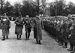 5 декабря 1940 года Квислинг слетал в Германию для обсуждения вопроса о будущем независимости Норвегии, 13 декабря он вернулся. Квислинг согласился объявить набор добровольцев для участия в боевых действиях в составе СС. В январе глава СС Генрих Гиммлер совершил поездку в Норвегию для наблюдения за подготовкой. Квислинг явно верил, что если Норвегия поддержит нацистскую Германию на полях сражений, то у гитлеровцев не будет причин её аннексировать. Поэтому он выступал против планов нахождения в Норвегии германской бригады СС, подчинённой непосредственно Гитлеру[104]. Он также ужесточил отношение к Великобритании, стране, укрывшей бежавшего короля. Квислинг более не видел в Британии союзника Скандинавии. Он одобрил германскую политику в отношении к евреям и выступил по этому поводу с речью во Франкфурте 26 марта 1941 года, где выступил за принудительное изгнание, но высказался против истребления[104].