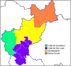 Штат Керетаро может быть разделён на 4 или 5 районов в зависимости от выбранного критерия. Это две центральные долины (Долина Керетаро и Долина Сан Хуана), засушливая область Семидесьерто, и два гористых района: Сьерра-Горда и Сьерра-Керетана.