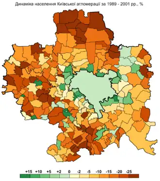 Как и Московская агломерация, Киевская демонстрирует вытянутость основной хорды транспортных магистралей в юго-западном направлении (в Москве эта тенденция была закреплена законодательно в виде новых границ города в 2012 году)[15]. Рост в северном направлении выражен слабее всего из-за наличия здесь зоны техногенной катастрофы (Чернобыльской АЭС)[16]. В постсоветское время привлекательность Киевской агломерации резко снизилась. Так, в Киевской области в 2000-е годы смогли увеличить число жителей всего несколько городов, рост не продемонстрировал ни один район, а некоторые из них потеряли более 10 % своего позднесоветского населения[17]. Особенно сильно приток в агломерацию уменьшился после 2013 года[15].