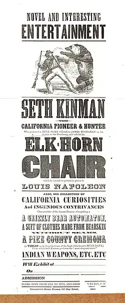 Касаясь доставки стула из рогов президенту Бьюкенену в 1857 году, Кинмэн сказал: «в одно прекрасное утро я проснулся и обнаружили себя знаменитым». Он использовал свою известность начиная с лета 1861 года, вместе с чревовещателем и фокусником Дж. Г. Кеньоном, при открытии выставки, сначала в Юрике, а потом в Сан-Франциско в августе того же года. Кинман показывал свои «раритеты», в том числе кресло из вапити с гризли, несколько скрипок и скальпов, и читал лекцию.