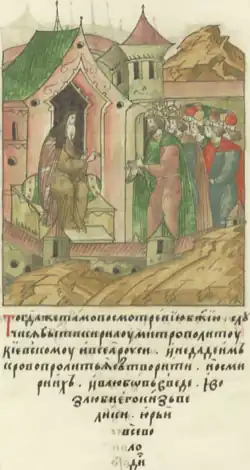 Поставление Кирилла I митрополитом Киевским. Миниатюра из Лицевого летописного свода. 70-е годы XVI века. (РНБ. F.IV.233. Л. 894 об.)
