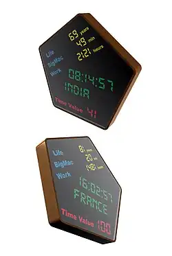 Важный для интерактивного искусства аспект времени раскрывается в двух следующих работах. Советское прошлое отдается в проекте «Цена времени» (Time Value, 2012). Зная, насколько в социалистическом государстве был обесценен труд простого человека, Ольга Киселёва спроецировала это знание на современные реалии. Здесь, как и во многих других своих работах[17], она выступает в роли художника-исследователя. Составными частями проекта являются: графическая серия, предсказывающая постепенное обесценивание человеческого труда когда-то в ближайшие десятилетия, по сути, представляя художественный прогноз на будущее, а также «умные» часы в форме советского «знака качества» — пятиугольника с закруглёнными краями. Несколько стоящих в ряд часов показывают время в разных точках мира, одновременно по специальной формуле подсчитывают «цену времени» в каждой из них и передают результат на встроенную бегущую строку.